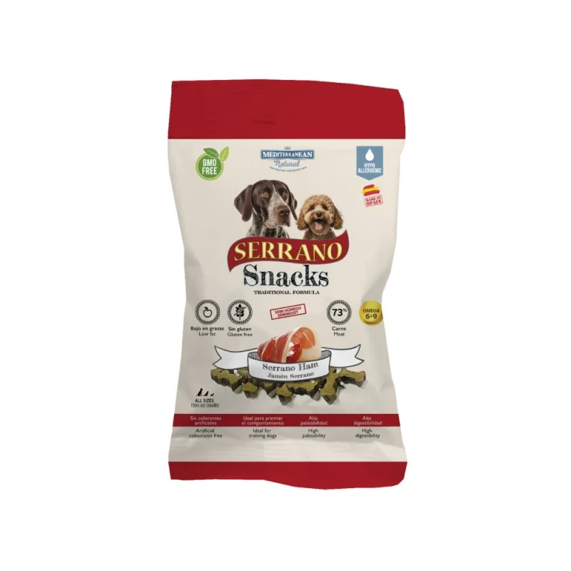 Το ζαμπόν Serrano είναι γνωστό για την ποιότητα και τη μοναδική του γεύση, και τώρα ο σκύλος σας μπορεί να το απολαύσει σε μορφή λιχουδιάς, σε πρακτική συσκευασία που διατηρεί τη φρεσκάδα.