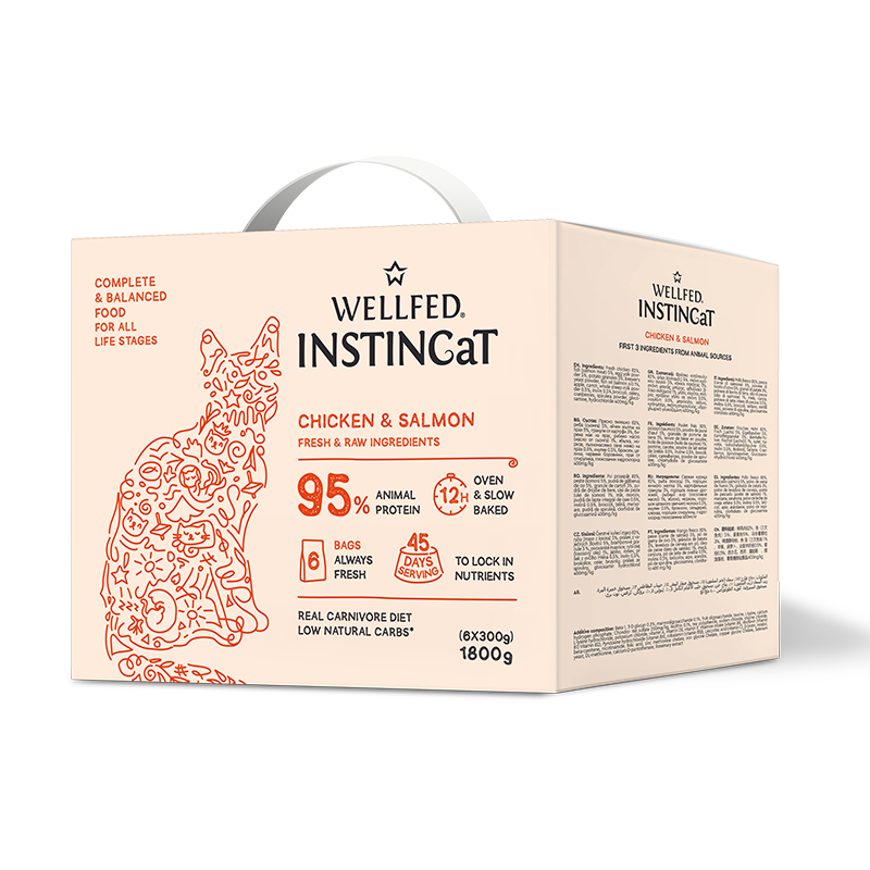 Προσφέρετε στη γάτα σας πλήρη και ισορροπημένη διατροφή με την Wellfed Instincat S.O.B., ιδανική για όλες τις ηλικίες. Με φρέσκο κοτόπουλο και σολομό, πλούσια σε πρωτεΐνη, ωμέγα-3 και θρεπτικά συστατικά, στηρίζει την υγεία του πεπτικού, την ενέργεια και τη λάμψη του τριχώματος. Μια premium ξηρά τροφή γάτας που συνδυάζει γεύση και ποιότητα για καθημερινή ευεξία. Παρασκευασμένη από φρέσκα συστατικά και ψημένη αργά στον φούρνο (slow oven baked), ώστε να διατηρεί αναλλοίωτη τη γεύση και τη θρεπτική της αξία. Προσφέρει πεπτικότητα που φτάνει έως και το 92%.